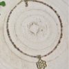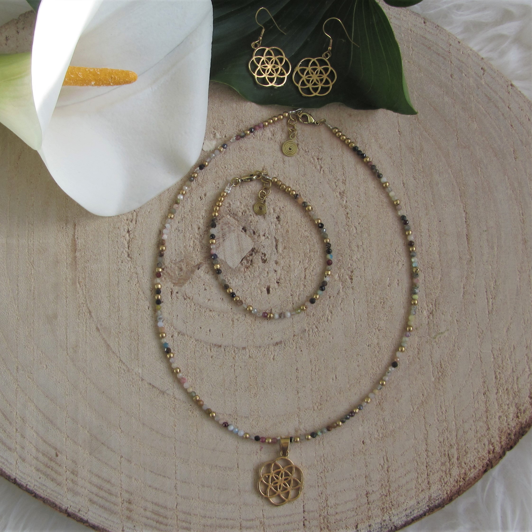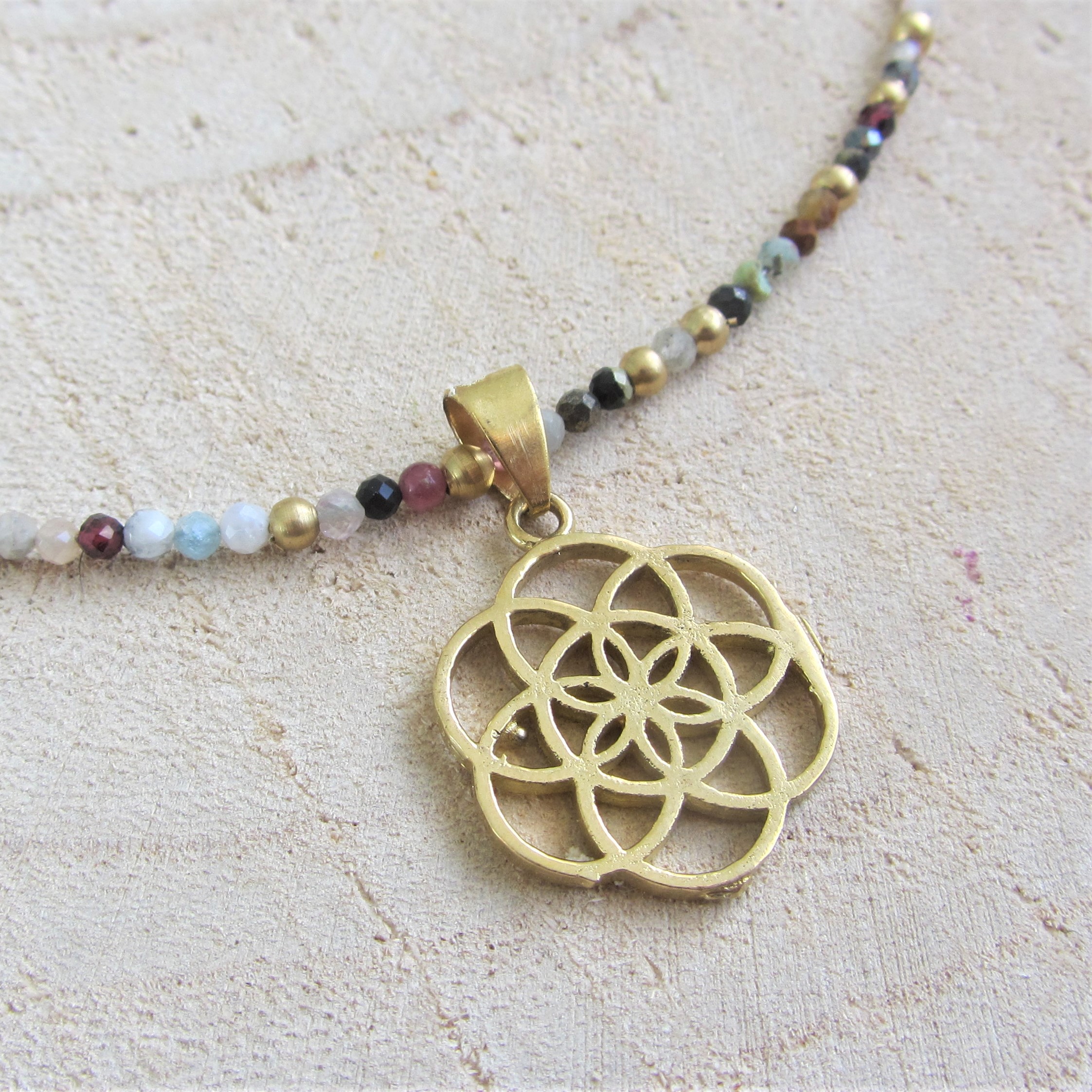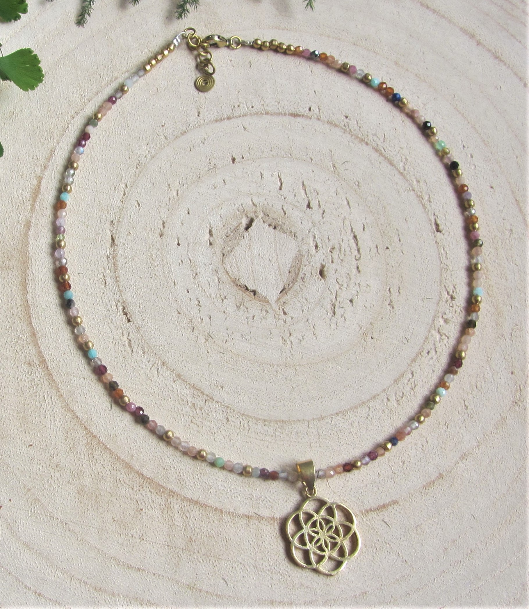 La gargantilla está hecha a mano, montada con ágata de colores facetadas (la piedra está tallada en caras) y abalorios de latón de primera calidad, libre de níquel. Tiene un colgante de latón con la semilla de la vida y una largaría de entre 38-40 cm con una cadenita que permite extenderla hasta los 42 cm. El cierre es tipo mosquetón muy fácil e intuitivo para cerrar.