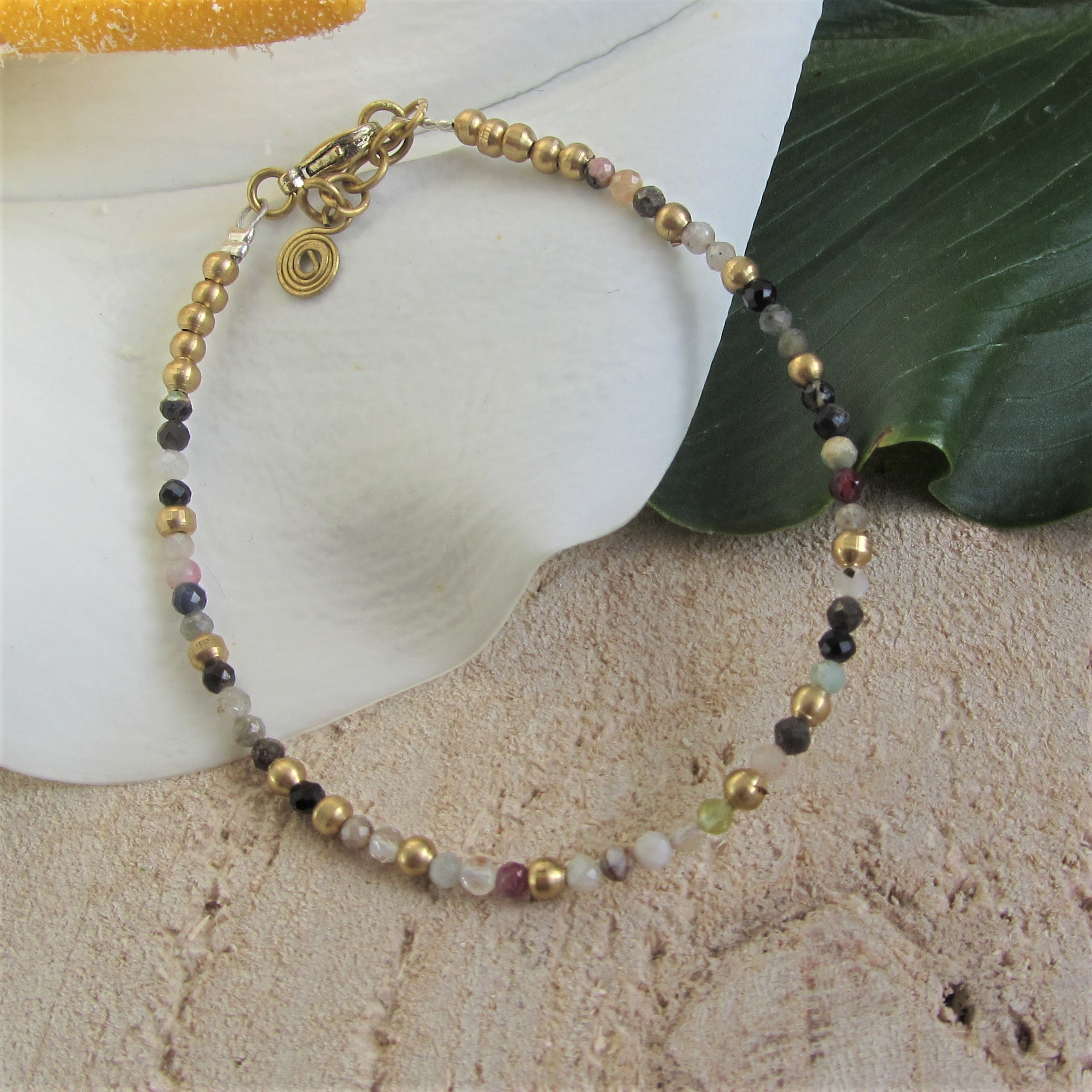 La pulsera también está hecha a mano montada con ágatas de colores facetadas y abalorios de latón de primera calidad y libre de níquel. Tiene un mini colgante de latón con forma de espiral. El cierre es tipo mosquetón muy fácil e intuitivo para cerrar. Consulta nuestra guía de tallas para hacerla perfecta a tu muñeca
